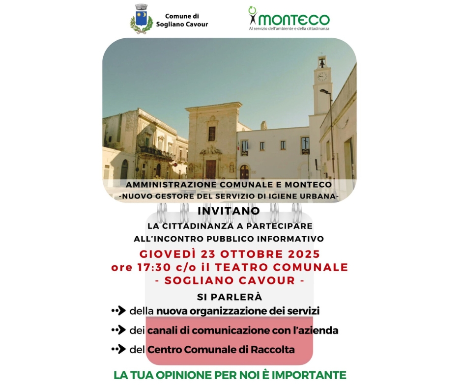 Il Comune di Sogliano Cavour e Monteco S.p.A., nuovo gestore del servizio di igiene urbana, invitano tutti i cittadini e le cittadine a partecipare all’incontro pubblico informativo che si terrà in data odierna, Giovedì 23 ottobre 2025 alle ore 17:30 presso Teatro Comunale – Sogliano Cavour.