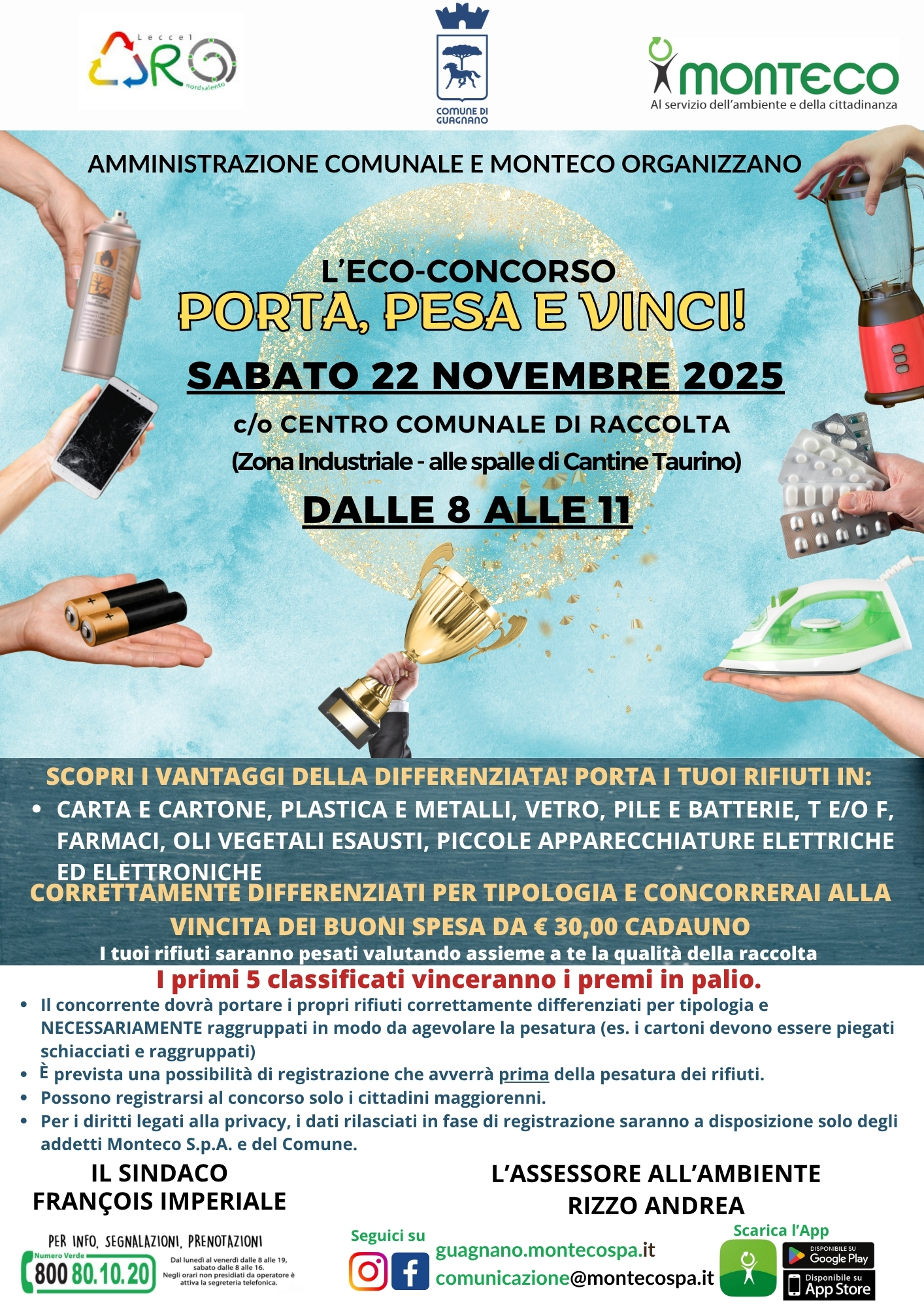 L’Eco Concorso “Porta Pesa e Vinci!”, organizzato dall'Amministrazione Comunale e Assessorato all'Ambiente in collaborazione con Monteco S.p.A. torna a Guagnano con l’obiettivo di promuovere sia l'uso del Centro Comunale di Raccolta che i vantaggi della Raccolta Differenziata incentivando la cittadinanza ad una corretta differenziazione dei rifiuti e stimolandone maggiormente l'impegno mediante una competizione virtuosa a premi.